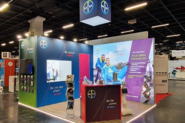 Darüberhinaus steckt jede Menge Technik in dem Messestand. Insgesamt wurden 3 Standard-Screens für Laptop-Präsentationen und ein 65 Zoll Touch-Screen für Kundenpräsentationen verbaut. 7,5m² Video–LED Panels sorgten zudem für staunende Blicke und die nötige Fernwirkung!